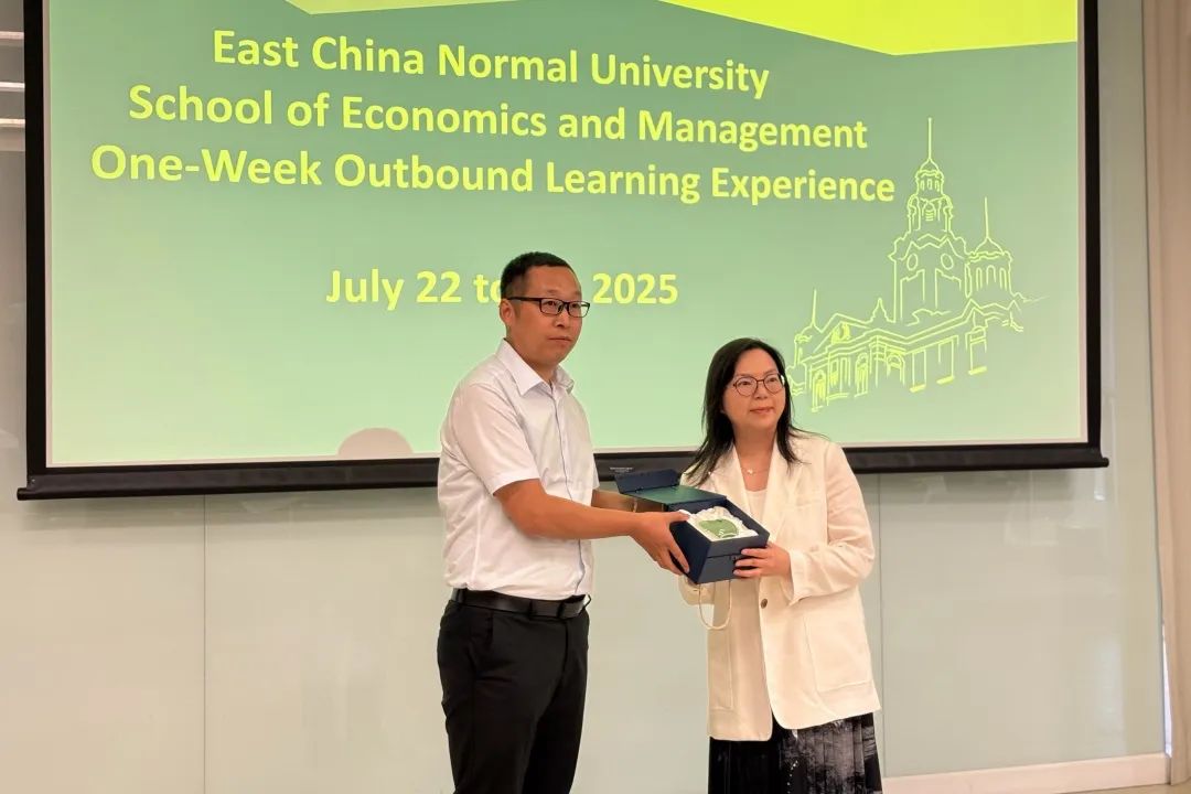 随后,李云鹤教授、MBA案例教学秘书王志利老师代表经管学院,向港大经管学院副院长梁教授、副教授Baniel赠送ECNU纪念品并合影留念。