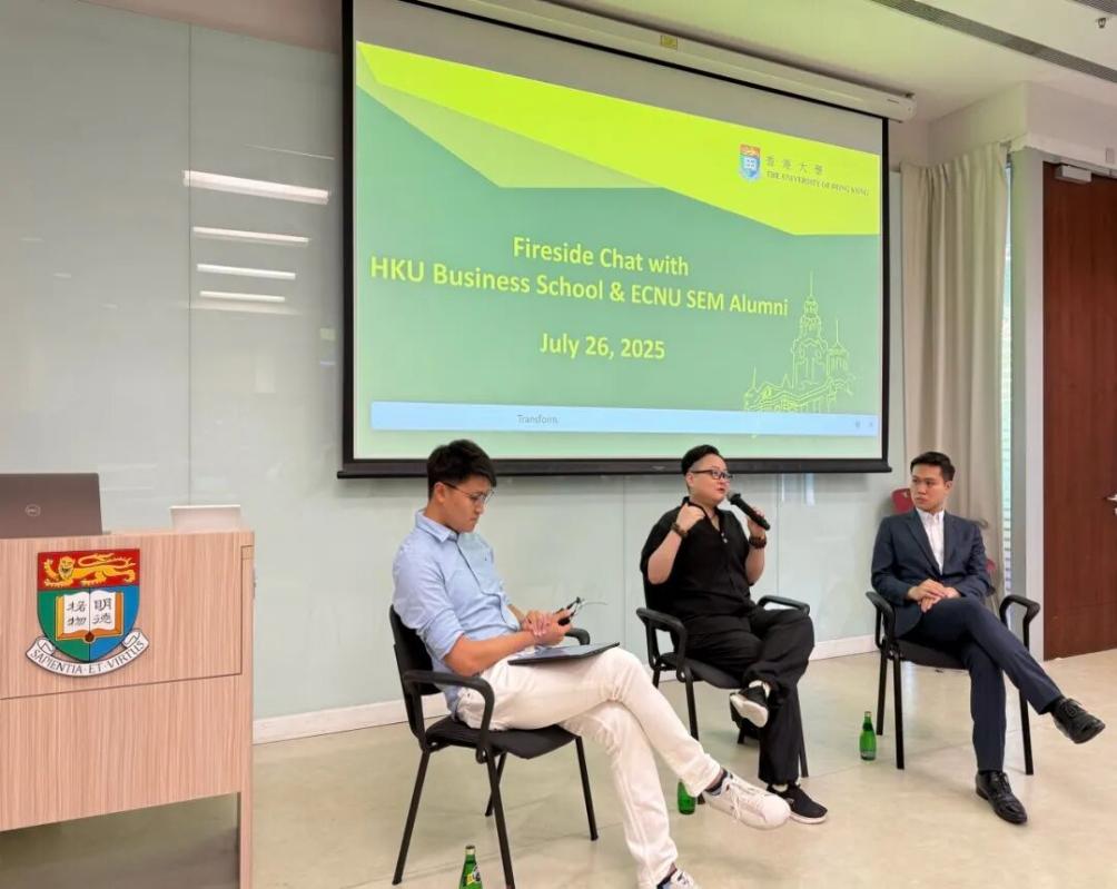 港大经管学院校友Kevin CHU(AI公司创办人)和Anthony FUNG(教育科技创业者)与华东师大MBA校友Sarah CHAN(并购咨询总监)分享职业转型经历,强调大湾区人脉资源的重要性。